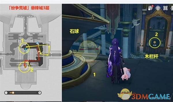 此时需要追踪任务指引,先前往3层的1号石球位置,攻击1号石球的底座,让石球下落并撞开2号任务点前的木栏杆。