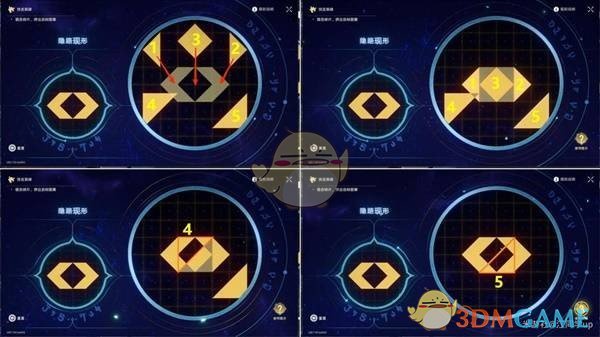 接着,将4号三角形放置在中间方形图案的左上角位置,再将5号三角形放置在中间方形图案的右上角位置,完成解密。