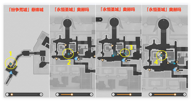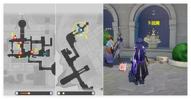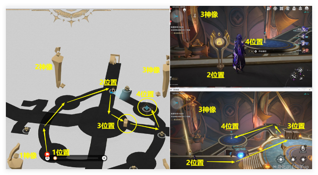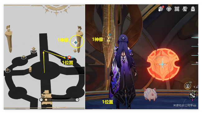 (3)接着会自动传送到下图地图,这里和主线任务最后解密差不多,就是激活4个神像,不过这里只需激活3个神像就行,能简单很多,先去1神像位置,长按空格键激活第1个神像即可