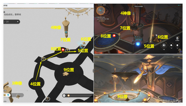 (5)接着去5位置操作手掌,将6位置的装置放到4神像的下面7位置后,再去8位置激活第4个神像,激活第4个神像后,地图中间9位置的平台就会打开