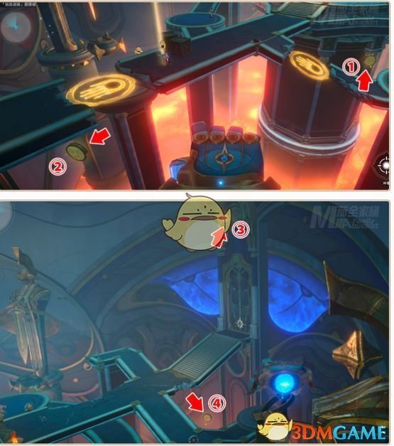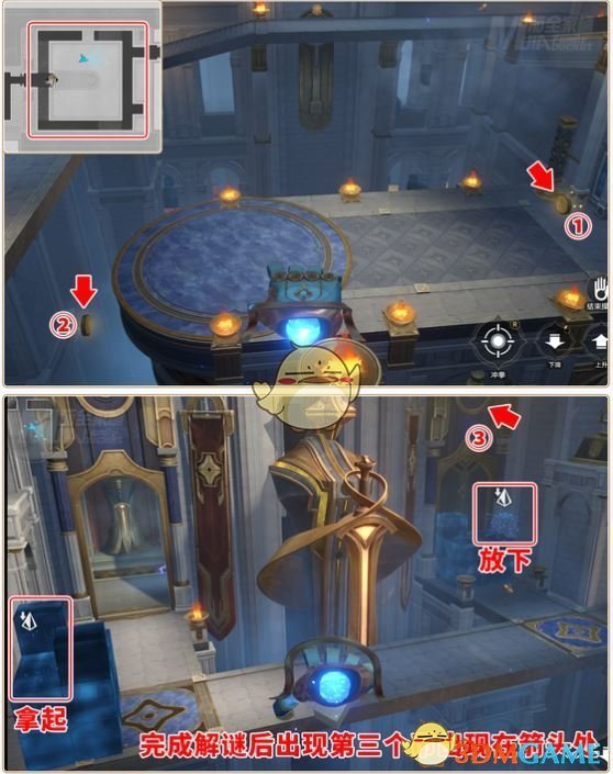 1、第一个宝箱:先来到右下角,开启机关,再前往左侧开启2号位的机关,然后拿取左下角的物品,再根据提示完成解密。