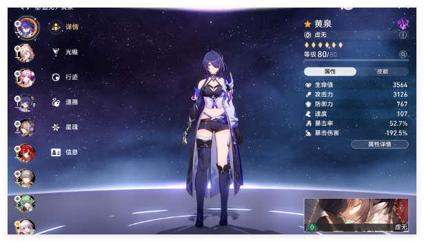 黄泉和椒椒行迹都是全拉满的,符玄没怎么练,生命只有6500+,10级战技,生存压力也不算大。宇宙市场趋势甚至没拉,就是个叠层工具人。