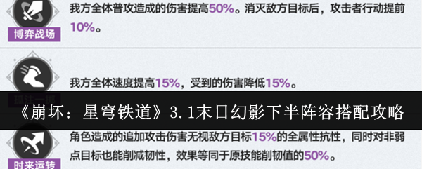 以上就是小编整理带来的崩坏星穹铁道3.1末日幻影下半阵容搭配攻略,更多相关游戏攻略,请关注这里下载站!