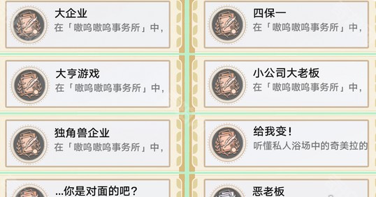3、大企业、四保一、大亨游戏、小公司大老板、独角兽企业:以上成就为「嗷呜嗷呜事务所」活动必拿。
