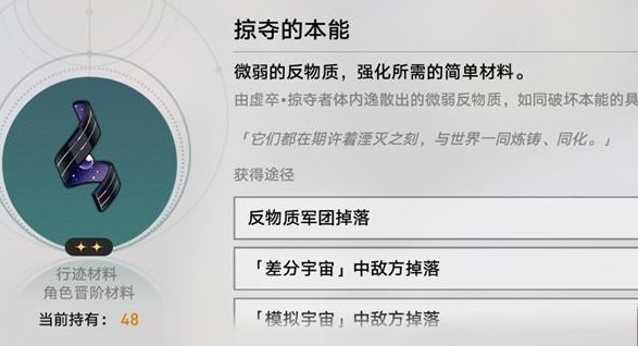 崩坏星穹铁道掠夺的本能是什么,掠夺的本能是一种角色养成材料,由虚卒掠夺者体内逸散出的微弱反物质,如同破坏本能的具现化。微弱的反物质,强化所需的简单材料。下面我们就一起来了解一下这种材料的用途吧。