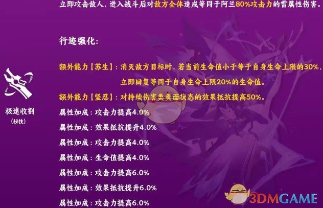 4、天赋 - 至痛至怒:根据阿兰当前损失的生命值百分比获得伤害加成,损失生命值越多,增伤越高。加成基于实时血量计算,例如天赋满级至多72%增伤,若血量损失50%,则增伤36% 。