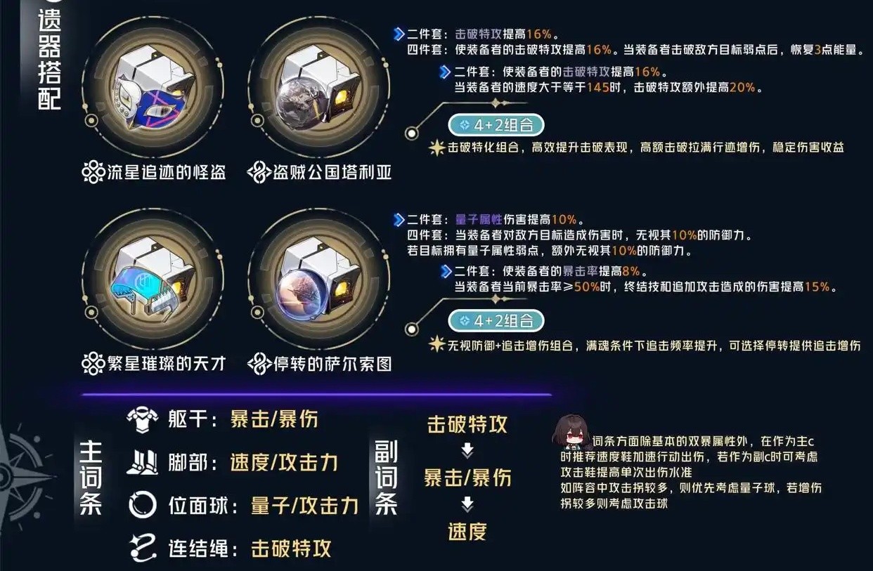 - 流星追迹的怪盗四件套:主要通过行迹1转化增伤,但雪衣全身增伤乘区多,边际收益问题导致综合不如量子套,娱乐玩法可考虑。