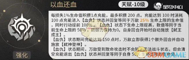 回复15%生命上限的生命值,对指定敌方单体造成160%生命上限的虚数属性伤害,同时对相邻目标造成100%生命上限的虚数属性伤害,并有100%基础概率使目标与相邻目标陷入嘲讽状态,持续1回合。施放终结技时若处于【血仇】状态,立即增加等同于30%当前生命上限的累计损失生命值 。不仅能造成巨额伤害,还能回复生命值和施加嘲讽效果。