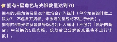 2、拥有不包含开拓者和未激活的星魂的5星角色和黑塔商店中的5星光锥数量达到70.