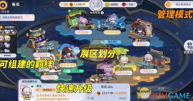 2、【特殊角色】每次升级会场等级,会开启全新的展会增益效果(额外增幅特定角色、某类展台、全场增益)。