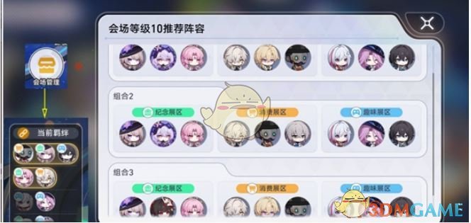 会场管理会给你推荐几种组合,皆为当前会场等级互拐不错的方案,对照安排角色即可。