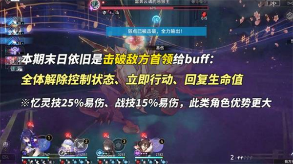 本轮幻影主打【快速击破】机制,每当击破Boss时,我方全体会解除控制状态、立即行动并回复生命值,配合环境增益,大多数阵容可舍弃生存位,直接堆输出暴力通关。
