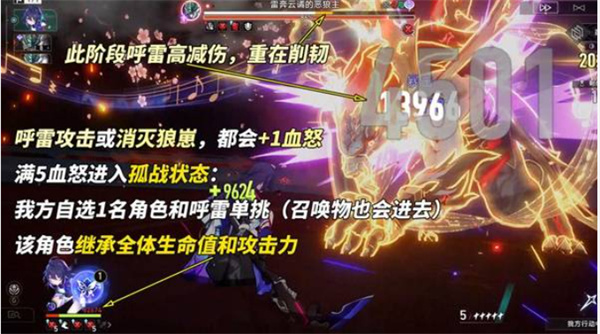 击杀狼崽会为呼雷叠加嗜血,满5层进入孤战,玩家自选一人单挑。该角色继承全队属性,并可携忆灵作战。