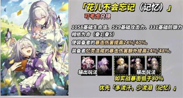 提供40%暴击伤害加成,忆灵暴击伤害再提升48%。