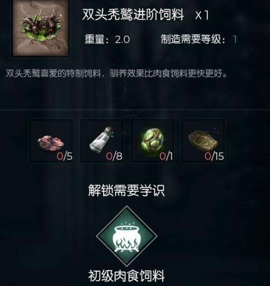 双头秃鹫:肉饲料:225 盐:360 蜘蛛毒囊:45 腐肉:675