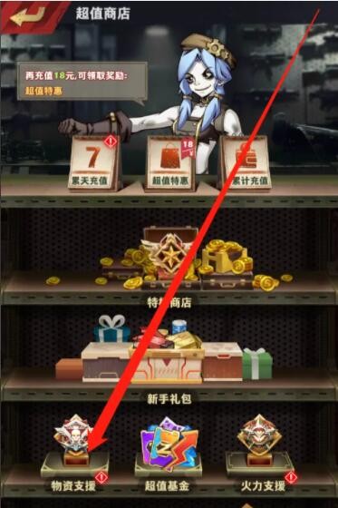 进入手游,点击超值商店图标,点击物资支援图标,打开物资支援活动界面,点击领取按钮,就可以领取对应的物资支援奖励了。