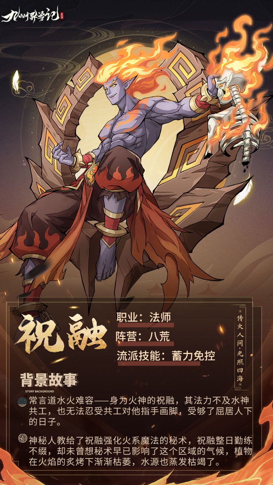 祝融是上古火神,非常的强大,在九州异兽记可以被收服,这个角色在游戏中表现如何,有什么技能?下面是小编给大家带来的《九州异兽记》祝融技能图鉴介绍,感兴趣的小伙伴们一起来看看吧。