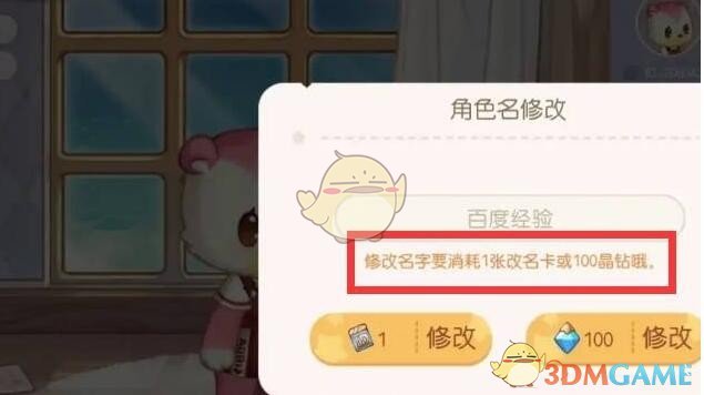 3、最后输入新的名字,点击修改就可以了,需要注意的是,改名需要用到改名卡或者消耗100晶钻。