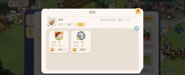 每个人每天可以购买20次道具,20次只看次数,不看购买量,也就是说你买了1次1个羊毛和买了1次99个羊毛都算作一次购买,因此尽量不要买单个上架的材料资源。道具基本只能一个一个的卖。