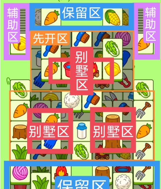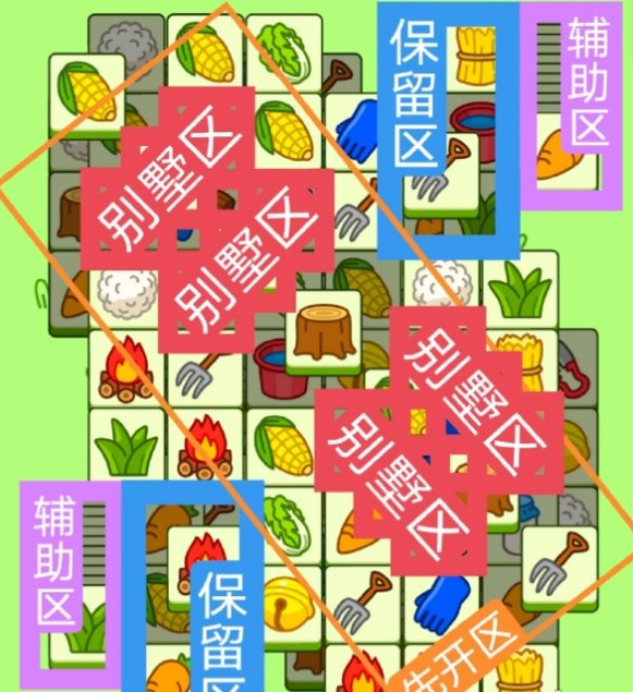 一个十字形大别墅,两个方形大别墅,开局先消除橙色区,然后按照一层层均匀消除表面牌, 哪里压牌比较多就先消除哪里,必要时可以用盲盒区辅助消除表面牌。尽量还是以别墅区内互相消除为主。蓝色区有叠牌,但是不多,全部保留到后期使用。