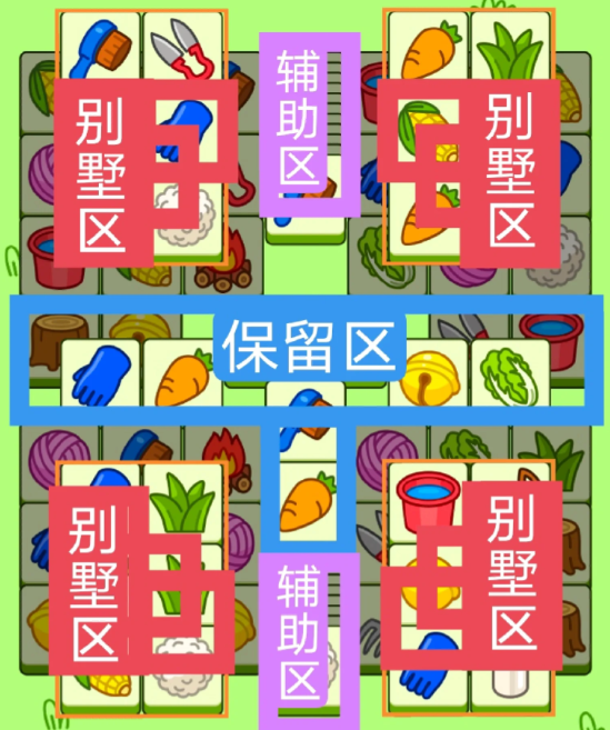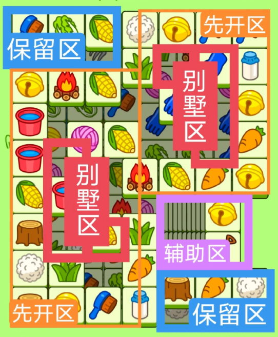 四个直角形大别墅,开局先消除橙色区,然后按照一层层均匀消除表面牌, 哪里压牌比较多就先消除哪里,必要时可以用盲盒区辅助消除表面牌。尽量还是以别墅区内互相消除为主。蓝色区有叠牌,但是不多,全部保留到后期使用。