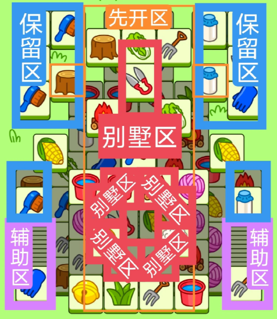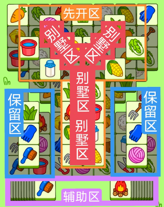 两个斜着的长形别墅,一个长形大别墅,开局先消除橙色区,然后按照一层层均匀消除表面牌, 哪里压牌比较多就先消除哪里,必要时可以用盲盒区辅助消除表面牌。尽量还是以别墅区内互相消除为主。蓝色区有叠牌,但是不多,全部保留到后期使用。