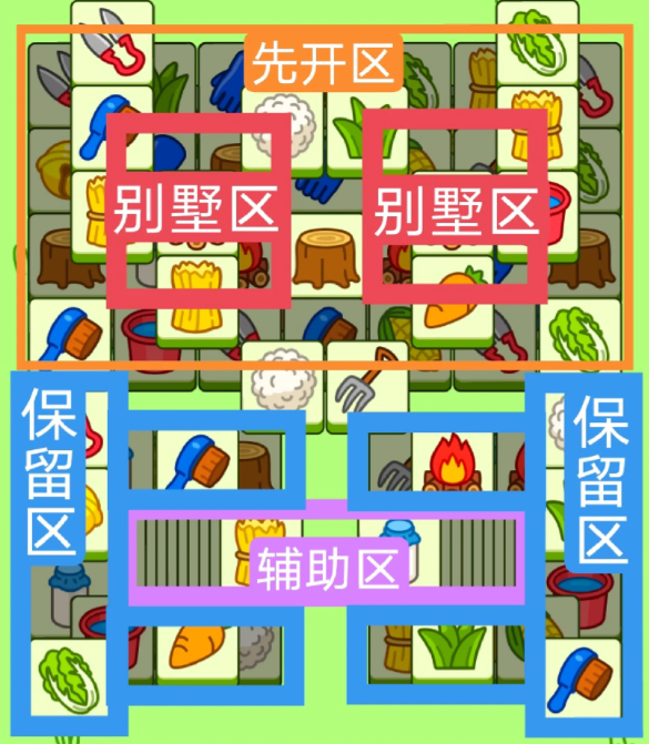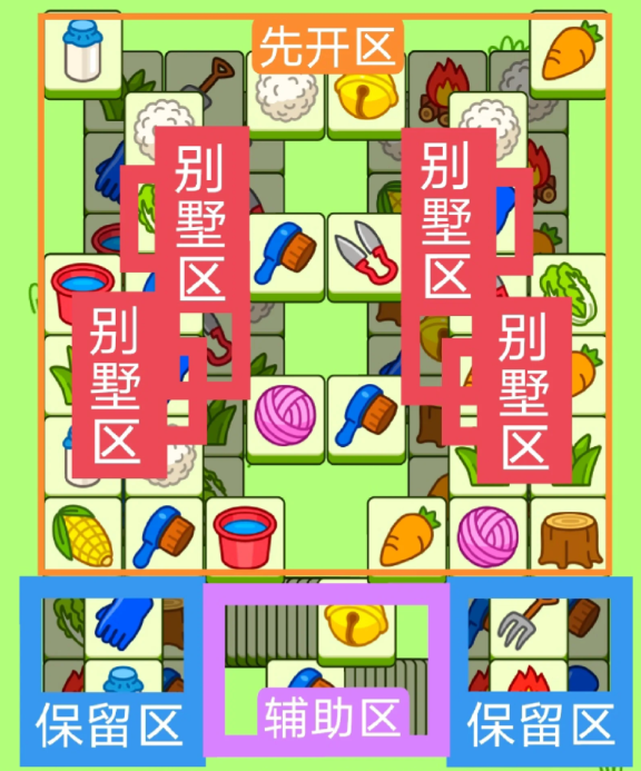 两个方型大别墅,开局先消除橙色区,然后按照一层层均匀消除表面牌, 哪里压牌比较多就先消除哪里,必要时可以用盲盒区辅助消除表面牌。尽量还是以别墅区内互相消除为主。蓝色区有叠牌,但是不多,全部保留到后期使用。