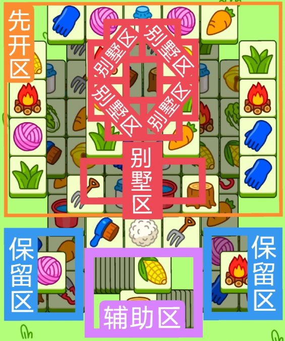 四个双叠牌小别墅,一个十字形大别墅,开局先消除橙色区,然后按照一层层均匀消除表面牌, 哪里压牌比较多就先消除哪里,必要时可以用盲盒区辅助消除表面牌。尽量还是以别墅区内互相消除为主。蓝色区有叠牌,但是不多,全部保留到后期使用。
