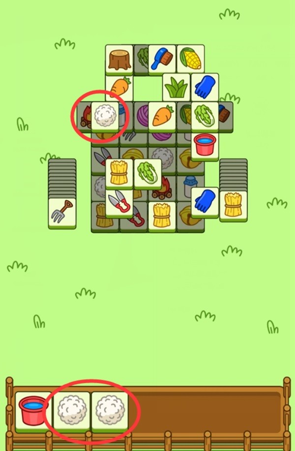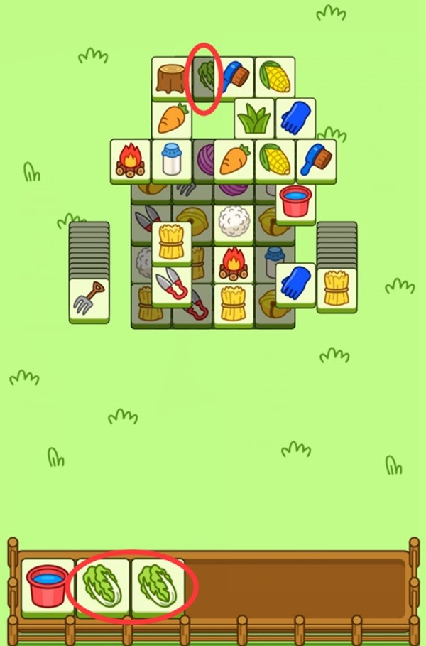 当场面上没有能够达成3消的卡牌时,我们可以观察位于下层暂时无法使用的卡牌,在点击上层卡牌后,下方的卡牌便可以使用了(如图中红圈内的白菜),这样我们就能消除一组白菜,但是在使用这个技巧时要避免手中无用卡牌堆积起来最终导致游戏失败。