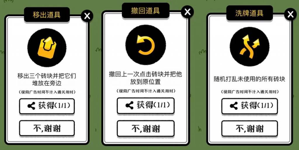 三个道具的功能分别是:暂时移出三个砖块,撤回上一次砖块,以及洗牌重新打乱砖块顺序。