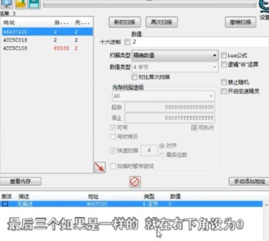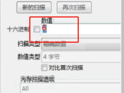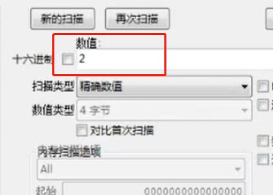 3、进入到进程里面后,需要扫描游戏,当羊了个羊游戏首次被扫描的时候,就需要在右边的【数值】下面写一个【2】。