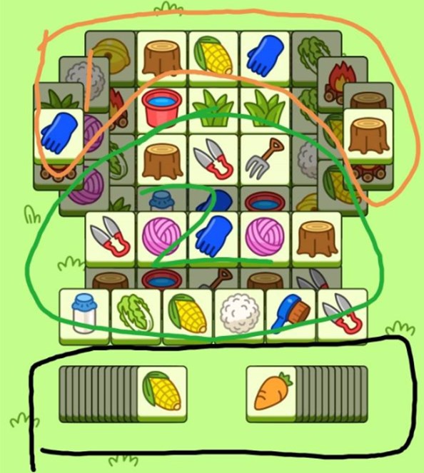 3、最下面盲牌区的【牌】前期可以配合【主消区】的牌来进行三消,这样就不会将格子卡死,清理到后面会留下一两张的牌。