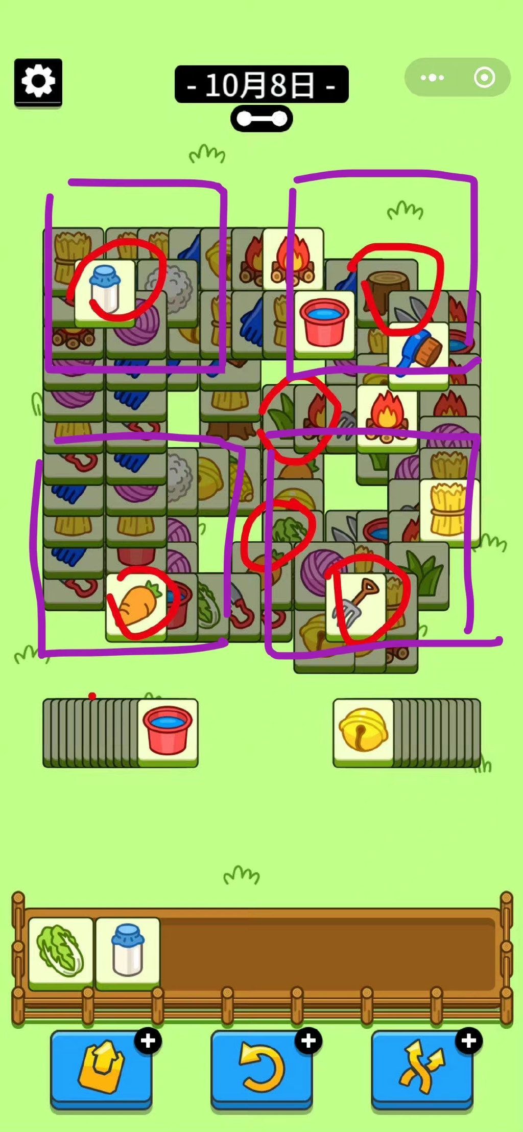 选择一个方位单独消除找出所在处的两种唯一三张牌消除(例如白菜胡萝卜/刷子木桩/叉子小草/组合)PS:左右盲牌可用辅助失误