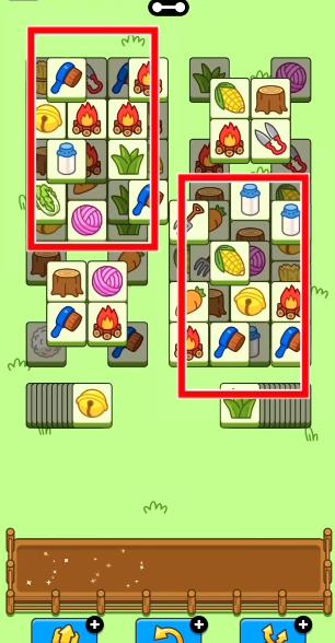 1.红色区域先互消几层,后面再用盲盒搭配着消,我是到图2那里才用盲盒.