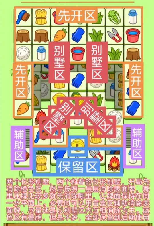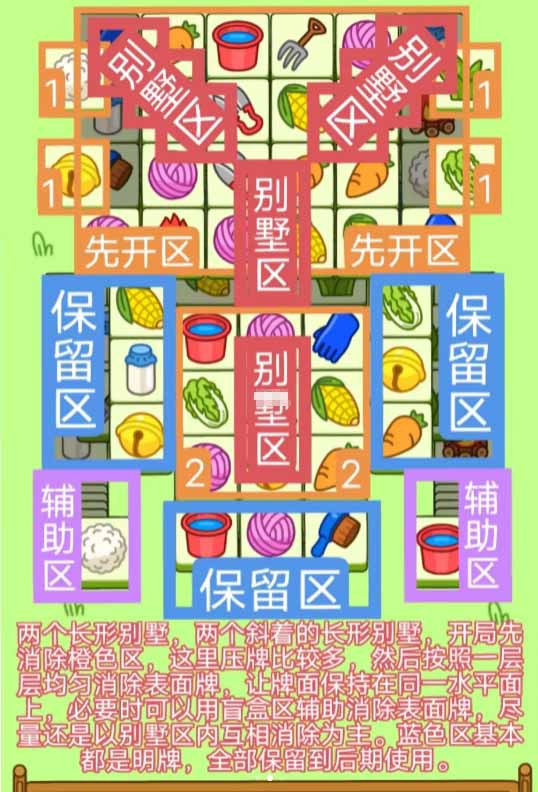 2、开局先消除橙色区的牌,这里压牌。尽量要让牌面保持在同一水平面,然后一层一层消除表面牌,不要跨层太多拿牌,等表面牌消除完后,以大别墅内互相消除为主。
