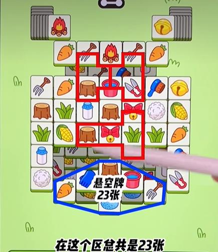 3、悬空牌有23张,楼梯那部分的牌是堆叠起来的,不是很好消除。