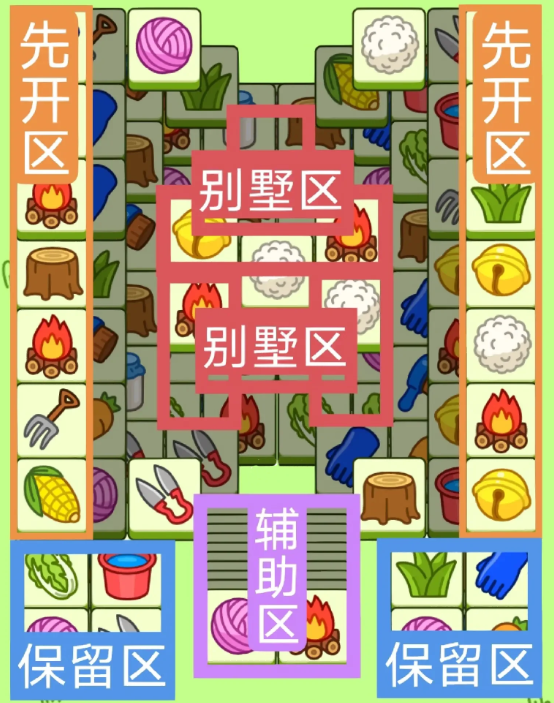 2.开局先消除橙色区的牌,这里压牌。尽量要让牌面保持在同一水平面,然后一层一层消除表面牌,不要跨层太多拿牌,等表面牌消除完后,以大别墅内互相消除为主。