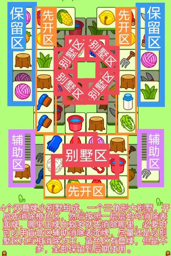 2.开局先消除橙色区的牌,这里压牌。尽量要让牌面保持在同一水平面,然后一层一层消除表面牌,不要跨层太多拿牌,等表面牌消除完后,以大别墅内互相消除为主。