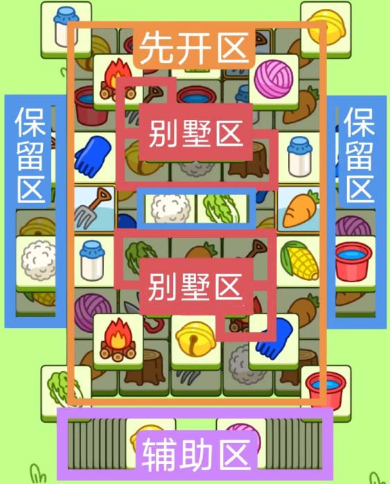 两个L字型大别墅,开局先消除橙色区,然后按照一层层均匀消除表面牌,哪里压牌比较多就先消除哪里,必要时可以用盲盒区辅助消除表面牌。尽量还是以别墅区内互相消除为主。蓝色区有叠牌,但是不多,全部保留到后期使用
