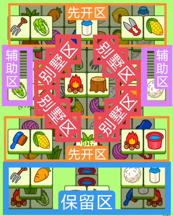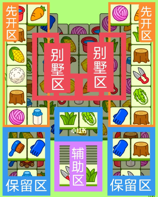 四个斜着的长形别墅组成,开局先消除橙色区,这里压牌此较多,然后按照一层层均匀消除表面牌,不要跨层太多拿牌。必要时可以用盲盒区辅助消除表面牌,尽量还是以别墅区内互相消除为王,蓝色区基本都是明牌,全部保留到后期使用。