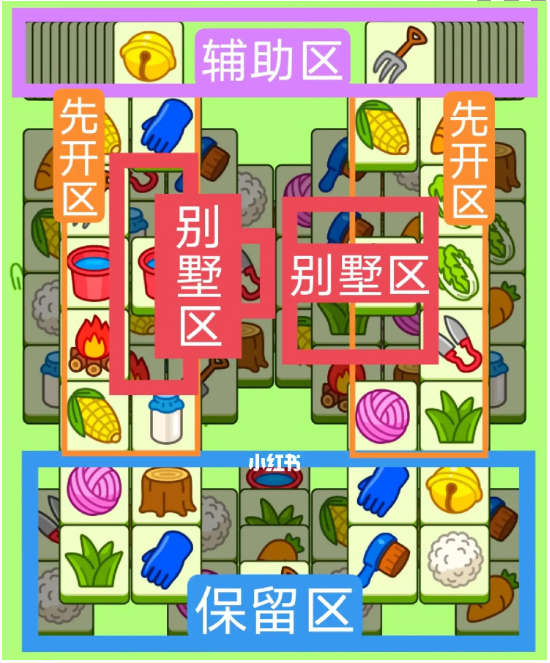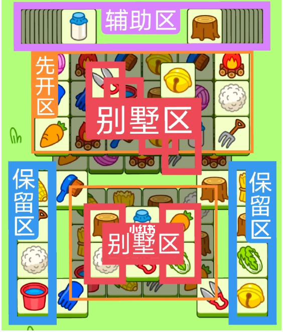 一个三角形大别墅,一个方形大别墅,开局先消除橙色区。橙色这里压牌此较多,然后按照一层层均匀消除表面牌。不要跨层太多拿牌,必要时可以用盲盒区辅助消除表面牌,尽量还是以别墅区内互相消除为主,蓝色区基本都是明牌,全部保留到后期使用。