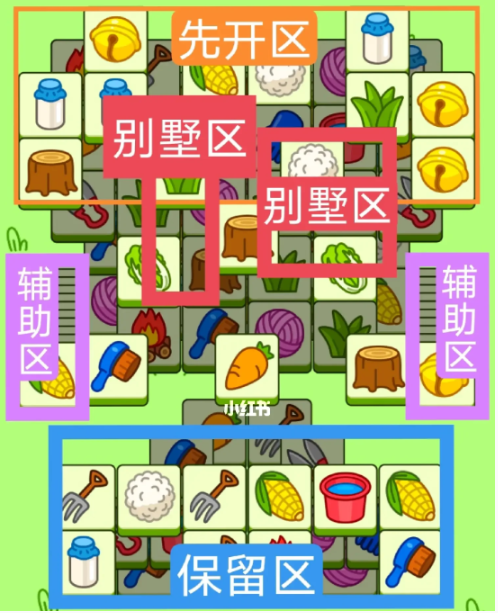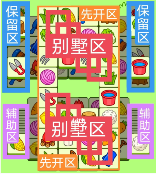一个T字型大别墅,一个方形大别墅。开局先消除橙色区,这里压牌比较多,然后按照一层层均匀消除表面牌,不要跨层太多拿牌,必要时可以用盲盒区辅助消除表面牌,尽量还是以别墅区内互相消除为主,蓝色区基本都是明牌,全部保留到后期使用。