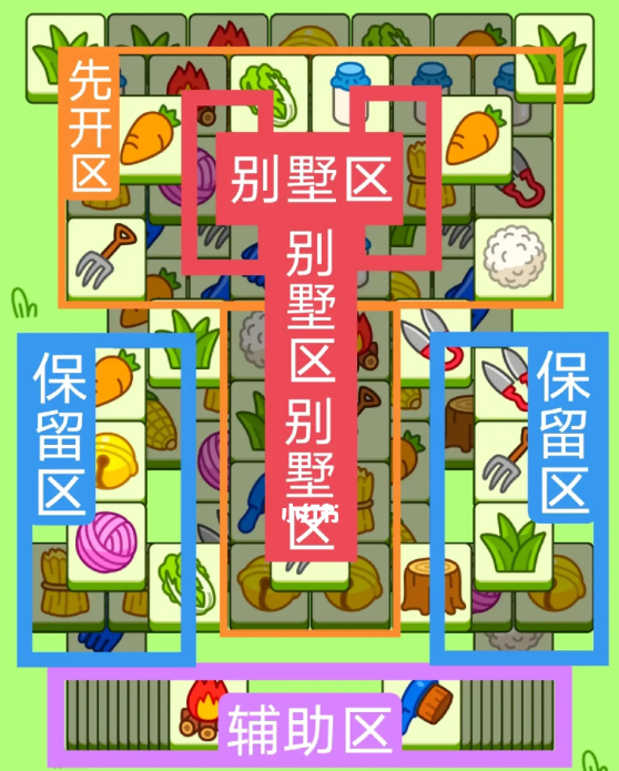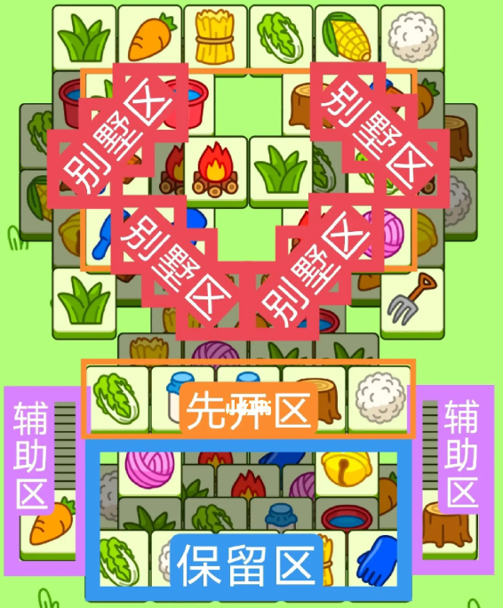 一个工字型大别墅,两个长形大别墅,开局先消除橙色区,然后按照一层层均匀消除表面牌,哪里压牌比较多就先消除哪里,必要时可以用盲盒区辅助消除表面牌,尽量还是以别墅区内互相消除为主,蓝色区有叠牌,但是不多,全部保留到后期使用。