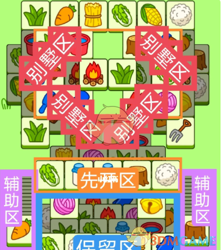 3.必要时可以用紫色盲盒区辅助消除,盲盒区后期不用留太多,留几张备用即可。