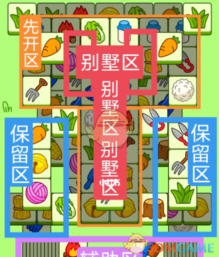 一个工字型大别墅,两个长形大别墅,开局先消除橙色区,然后按照一层层均匀消除表面牌,哪里压牌比较多就先消除哪里,必要时可以用盲盒区辅助消除表面牌,尽量还是以别墅区内互相消除为主,蓝色区有叠牌,但是不多,全部保留到后期使用。