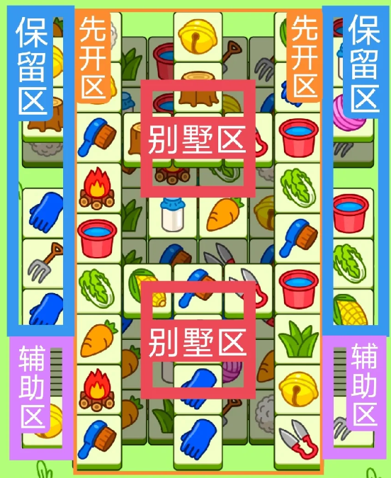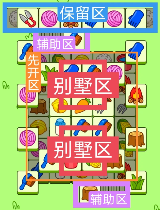 红色区域为今天的别墅区,开局先消除橙色区,然后按照一层层均匀消除表面牌, 哪里压牌比较多就先消除哪里,必要时可以用盲盒区辅助消除表面牌。尽量还是以别墅区内互相消除为主。蓝色区有叠牌,但是不多,全部保留到后期使用。