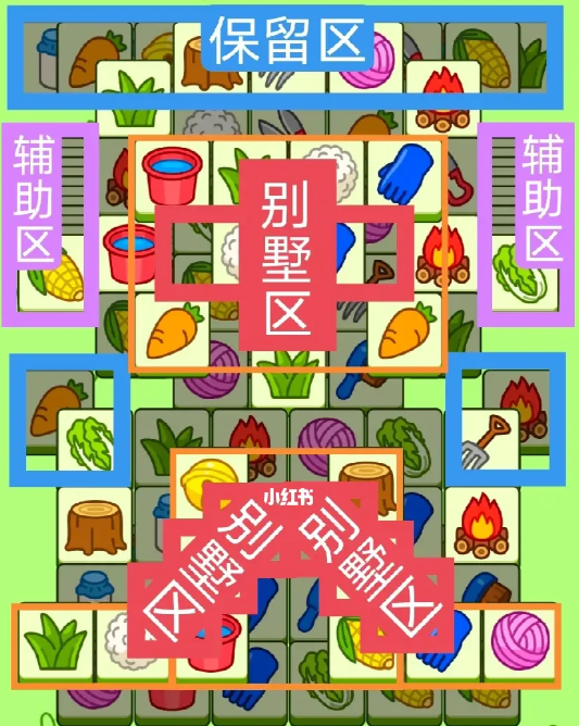 两个方形大别墅,开局先消除橙色区然后按照一层层均匀消除表面牌, 哪里压牌比较多就先消除哪里,必要时可以用盲盒区辅助消除表面牌。尽量还是以别墅区内互相消除为主。蓝色区有叠牌,但是不多,全部保留到后期使用。