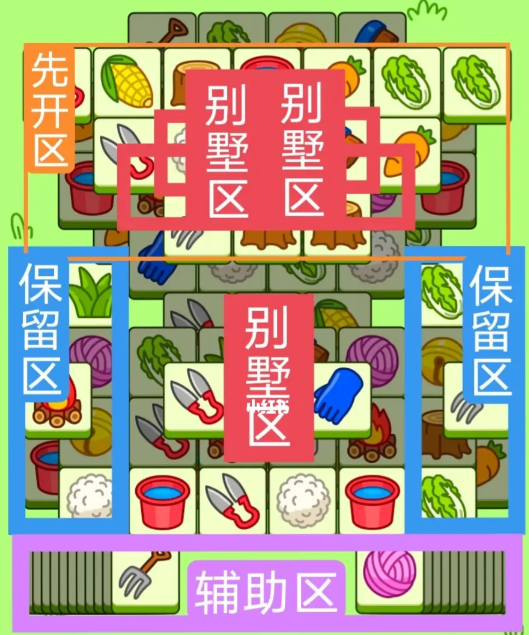 两个直角形大别墅,一个长形大别墅,开局先消除橙色区然后按照一层层均匀消除表面牌, 哪里压牌比较多就先消除哪里,必要时可以用盲盒区辅助消除表面牌。尽量还是以别墅区内互相消除为主。蓝色区有叠牌,但是不多,全部保留到后期使用。