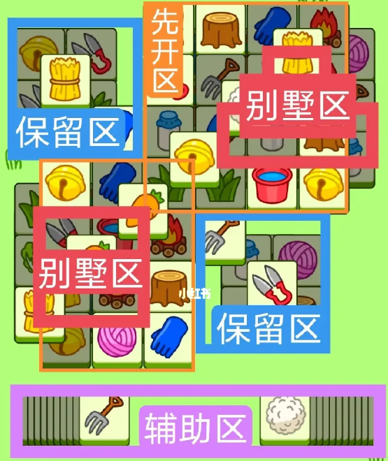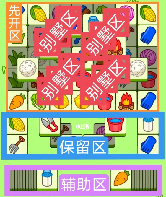 四个斜着的长形别墅组成,开局先消除橙色区然后按照一层层均匀消除表面牌, 哪里压牌比较多就先消除哪里,必要时可以用盲盒区辅助消除表面牌。尽量还是以别墅区内互相消除为主。蓝色区有叠牌,但是不多,全部保留到后期使用。
