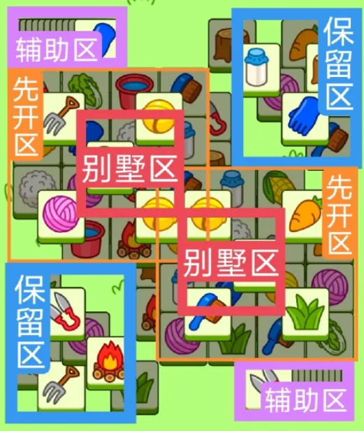 3.必要时可以用紫色盲盒区辅助消除,盲盒区后期不用留太多,留几张备用即可。